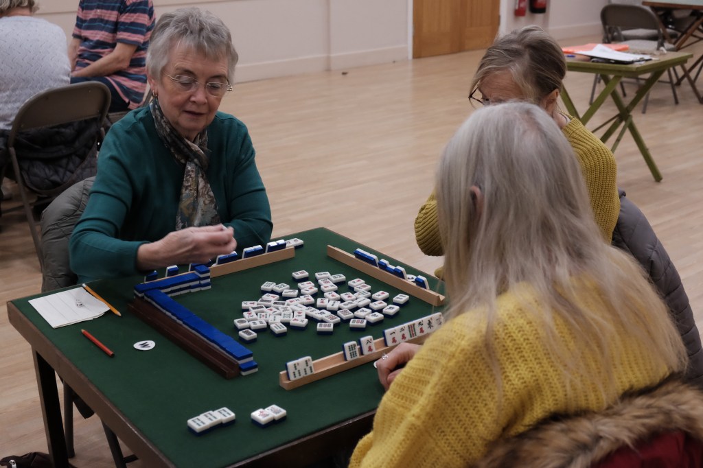 This is a Chinese game for three or four people, using tiles instead of cards. The play is very similar to Rummy, collecting 3 of a suit or runs of a suit. Please contact Martin for further information. Beginners are welcome.
